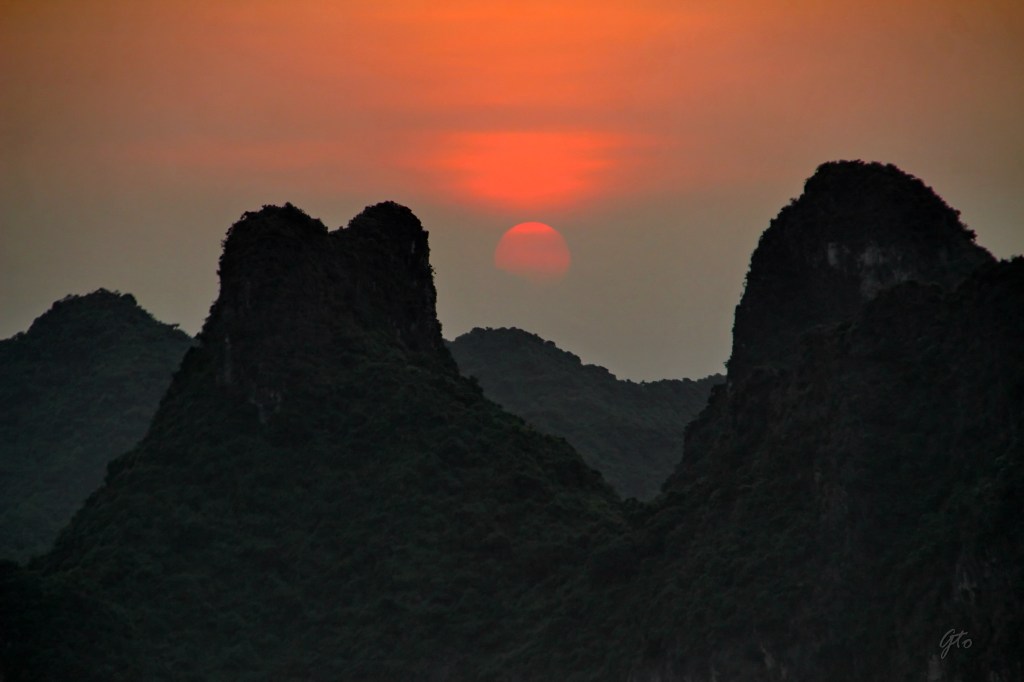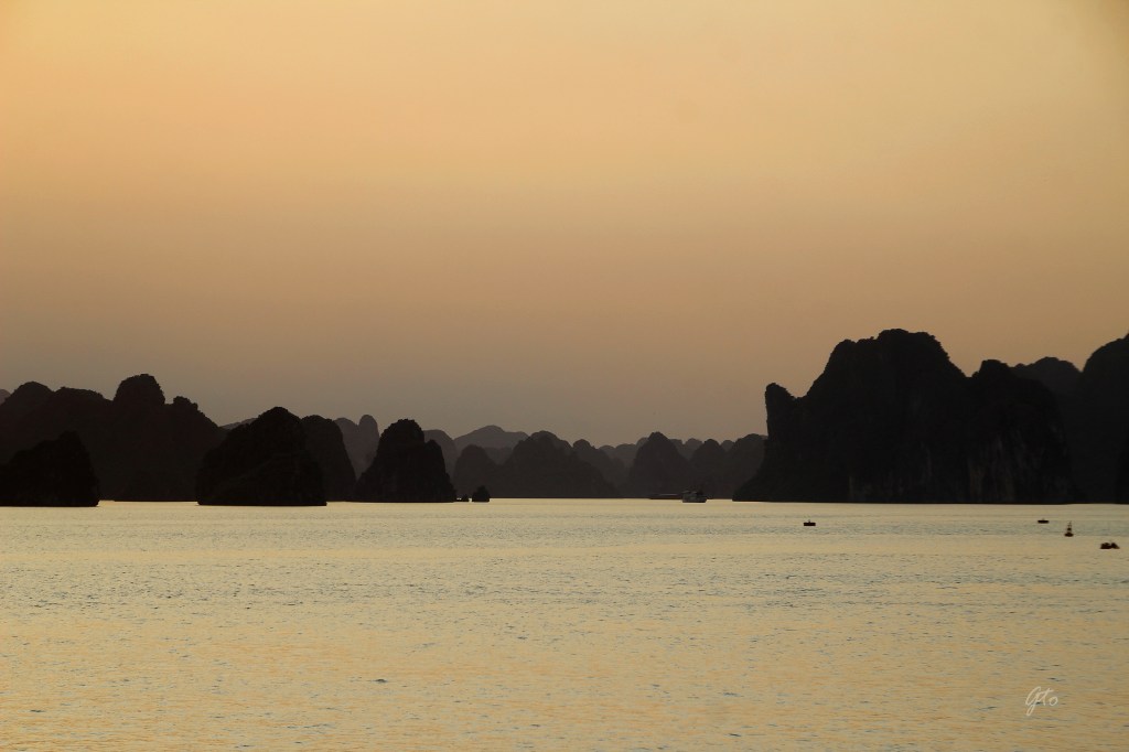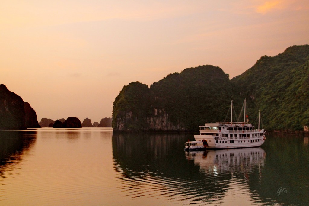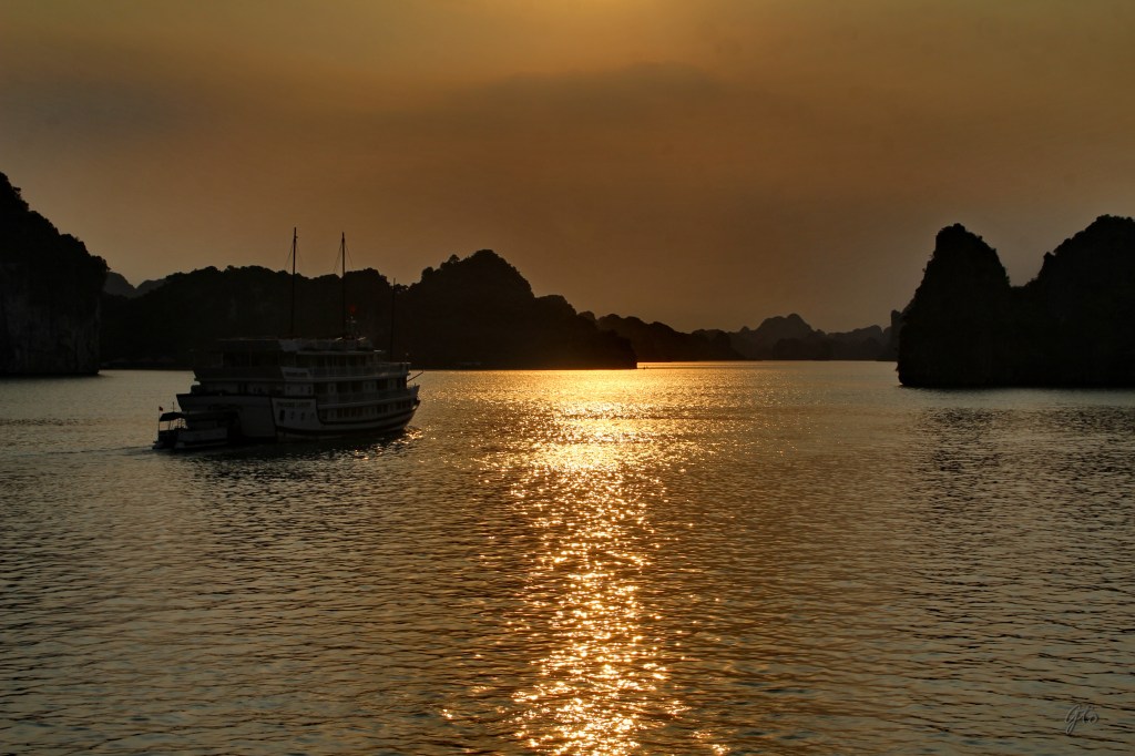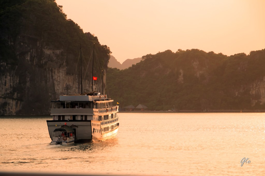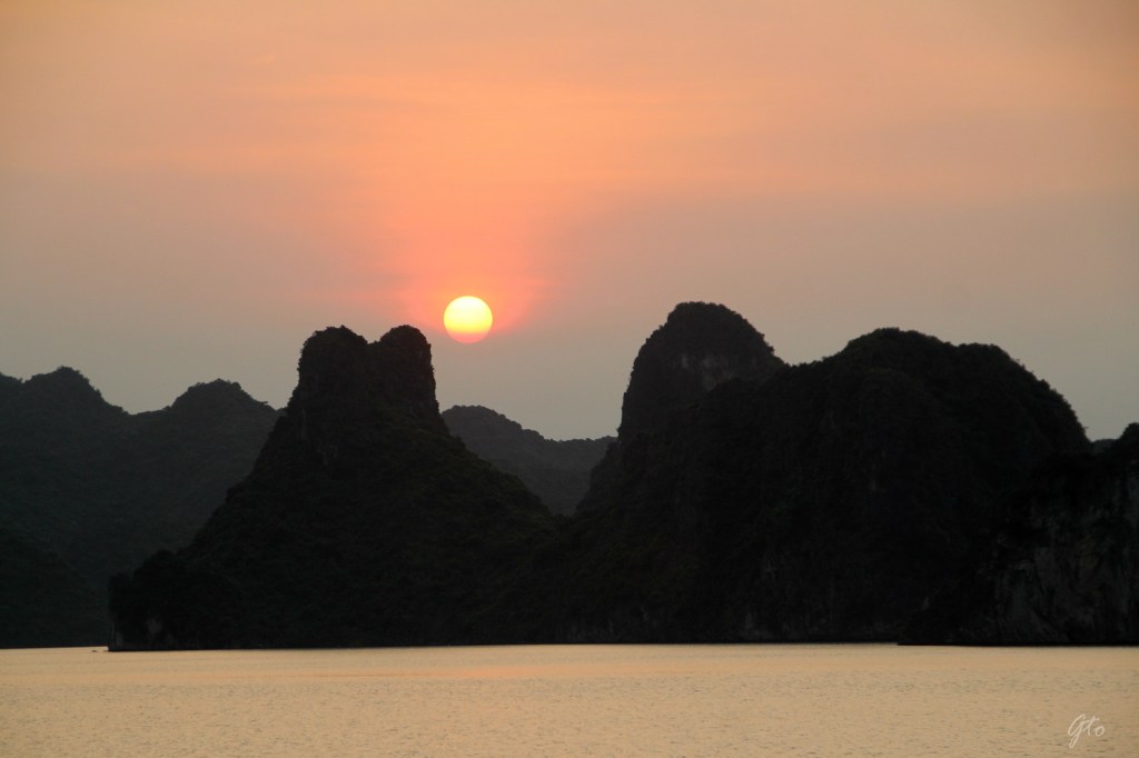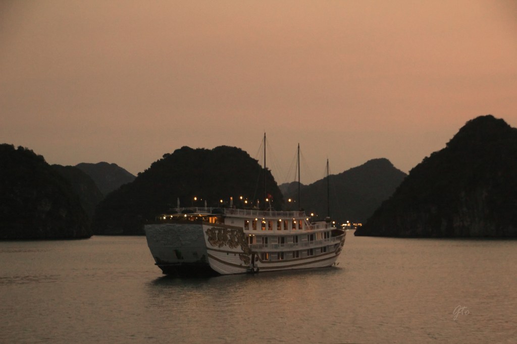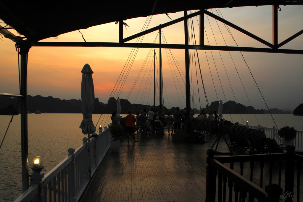 Después de la visita, de nuevo en el transbordador nos trasladamos de nuevo al barco, donde nos esperaba una merecida ducha y aire acondicionado. El calor en la zona es un tanto sofocante, por el nivel de humedad tan alto en la bahía de Halong. Después de la ducha, hay que subirse a la cubierta del barco, a coger un buen sitio a la sombra para tomarte algo con los amigos, hacer fotos y ver un espectacular atardecer entre las formaciones rocosas mientras que el barco navega al lugar donde haremos noche. (muy recomendable, llevarte tu botellita de ron, o ginebra para que no te falte de nada)