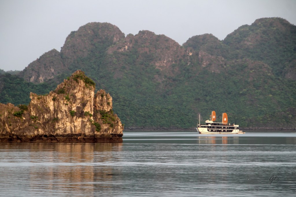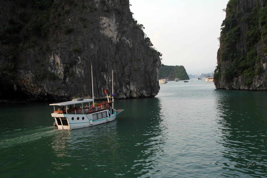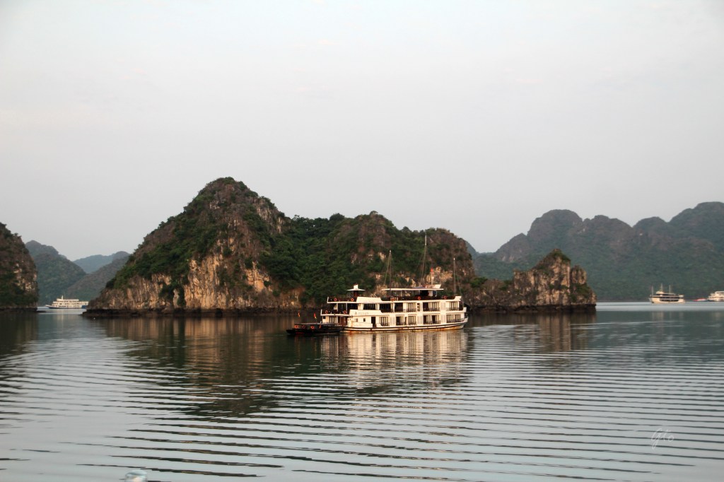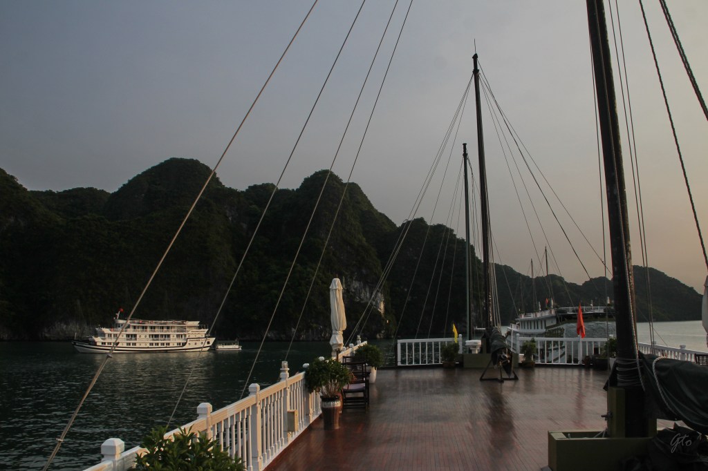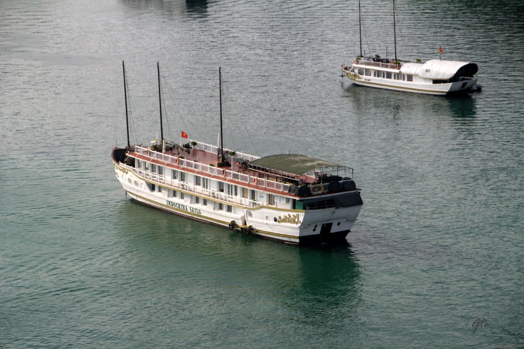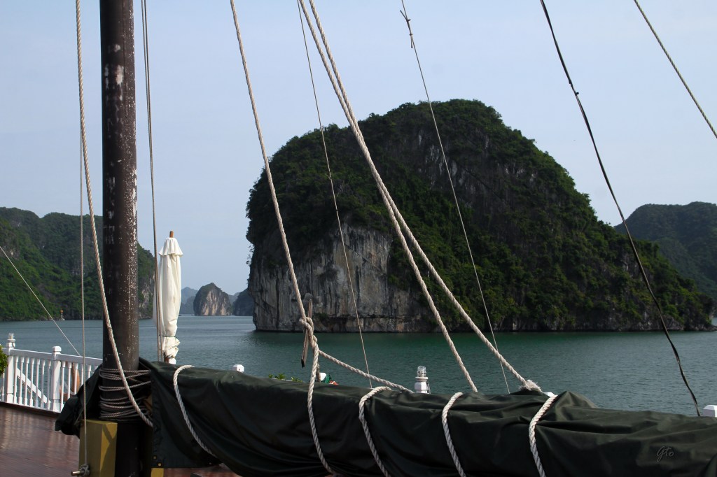 Los barcos son todos del mismo corte, imitando por fuera a los antiguos veleros de Juncos, muy bien decorados por dentro en maderas nobles. Nuestra compañía era la Indochina Sails, y el barco la verdad es que era cómodo y bonito. El embarque se realiza de forma muy curiosa, primero entras en una oficina con aire acondicionado, donde te dan un zumito de bienvenida, te recogen equipaje y concentran al grupo para el embarque. y cuando esta todo listo, te ponen un chaleco y en un pequeño barquito trasbordador te llevan al barco, atracado lejos del muelle, listo para zarpar, bienvenida de la tripulación y zarpa al momento.