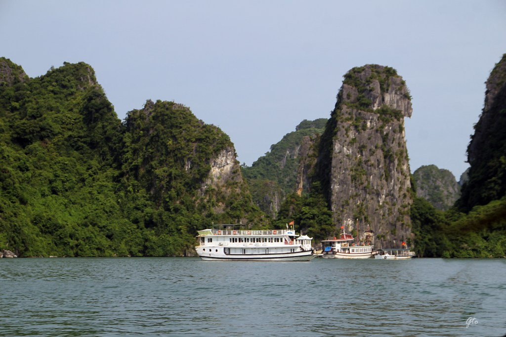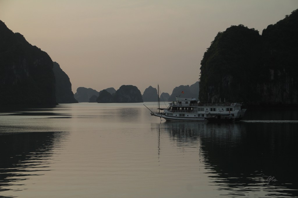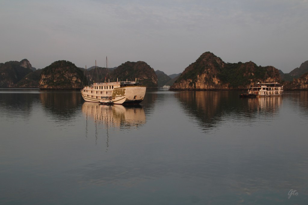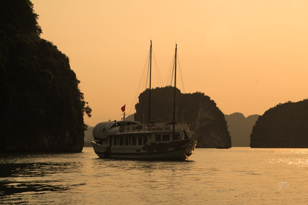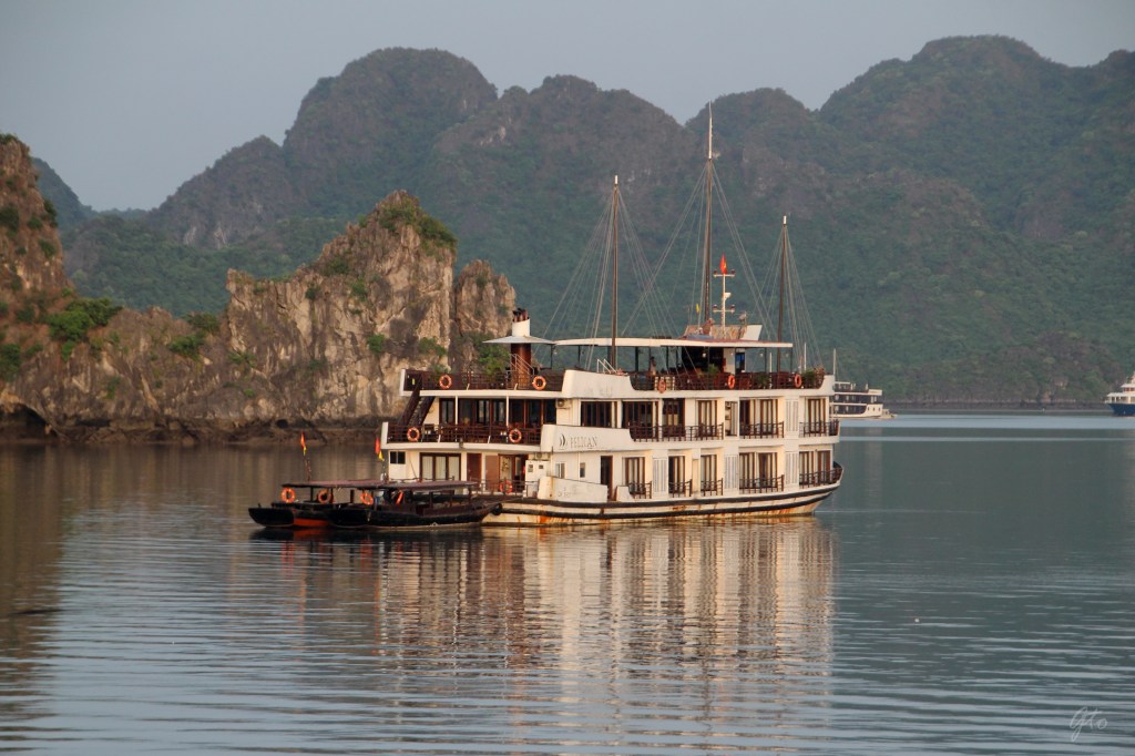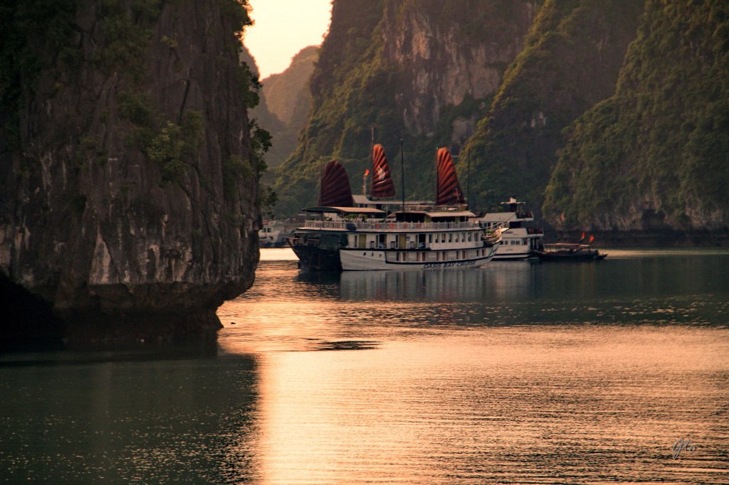 Los barcos son todos del mismo corte, imitando por fuera a los antiguos veleros de Juncos, muy bien decorados por dentro en maderas nobles. Nuestra compañía era la Indochina Sails, y el barco la verdad es que era cómodo y bonito. El embarque se realiza de forma muy curiosa, primero entras en una oficina con aire acondicionado, donde te dan un zumito de bienvenida, te recogen equipaje y concentran al grupo para el embarque. y cuando esta todo listo, te ponen un chaleco y en un pequeño barquito trasbordador te llevan al barco, atracado lejos del muelle, listo para zarpar, bienvenida de la tripulación y zarpa al momento.