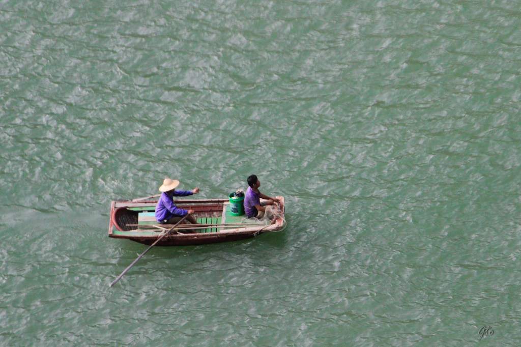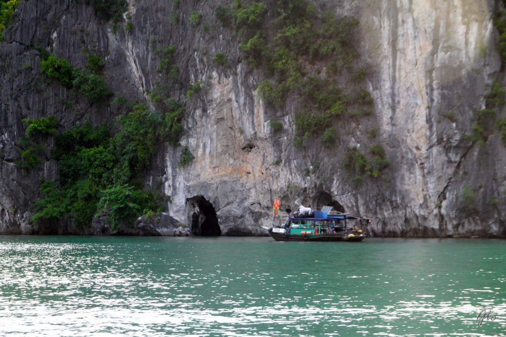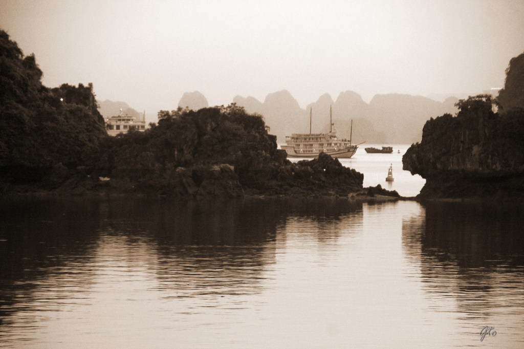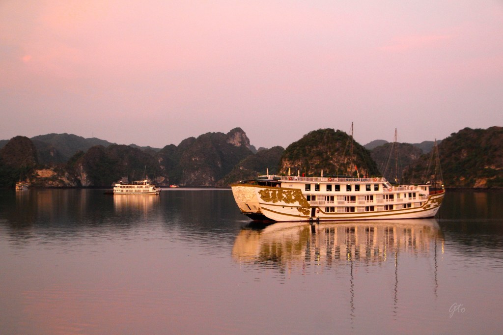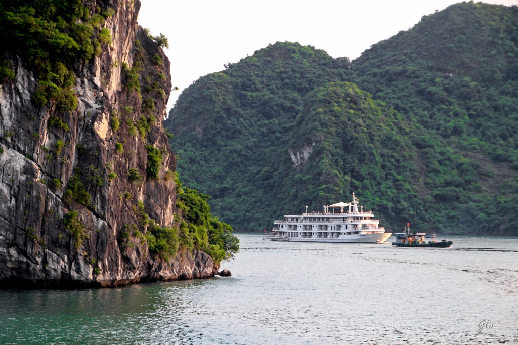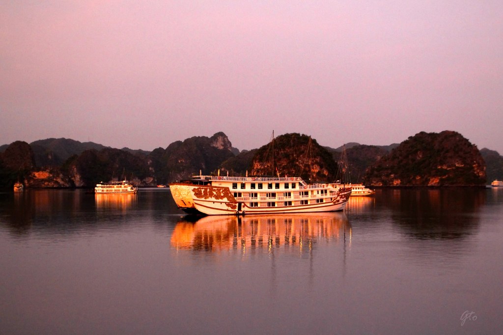 Los barcos son todos del mismo corte, imitando por fuera a los antiguos veleros de Juncos, muy bien decorados por dentro en maderas nobles. Nuestra compañía era la Indochina Sails, y el barco la verdad es que era cómodo y bonito. El embarque se realiza de forma muy curiosa, primero entras en una oficina con aire acondicionado, donde te dan un zumito de bienvenida, te recogen equipaje y concentran al grupo para el embarque. y cuando esta todo listo, te ponen un chaleco y en un pequeño barquito trasbordador te llevan al barco, atracado lejos del muelle, listo para zarpar, bienvenida de la tripulación y zarpa al momento.