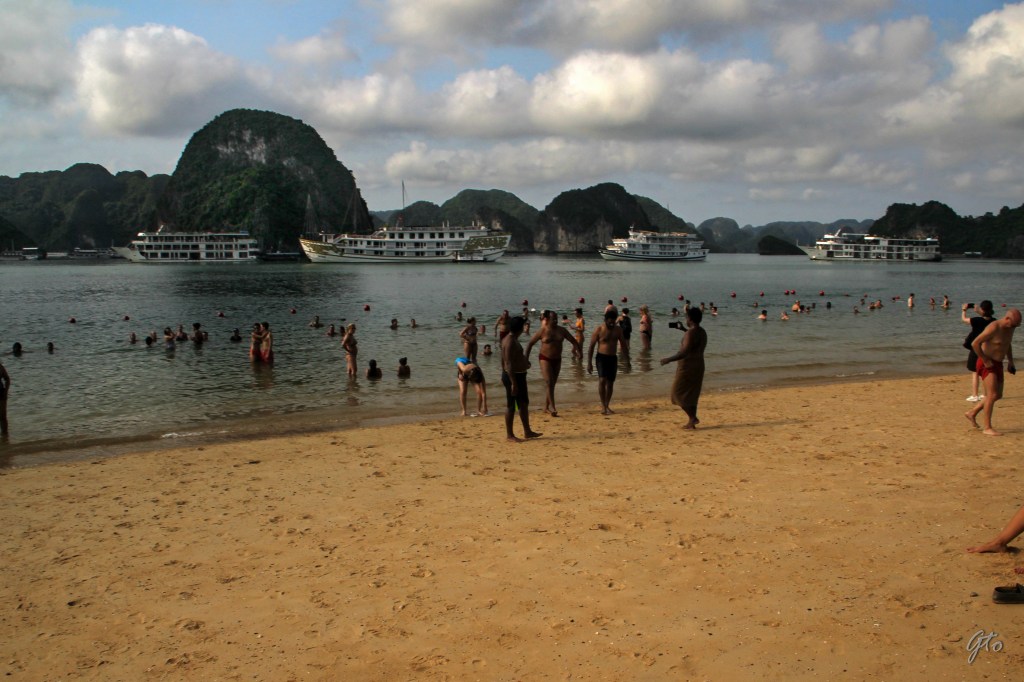 El agua esta caliente y un tanto turbia, pero ya te ducharas en el hotel. Las aguas de la Bahia de Halong, en general son muy turbias, con un color verdoso bonito de ver, pero delatan un problema de contaminación importante. La cantidad tan tremenda de barcos turísticos, unido a la gran cantidad de turismo que soporta a diario la bahía, lo llevaron a un extremo mas que alarmante. Hace unos pocos años, las autoridades están empezando a limitar esta contaminación, obligando a muchos cambios en los barcos para ser homologados, prohibir las botellas de agua, las pajitas de plástico, etc, etc. En Agosto del 2019, no se veían residuos flotando en el agua, pero si que se ve el agua turbia.