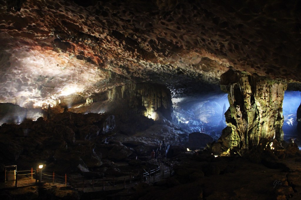 Navegando entre los islotes, te sirven el almuerzo un buffet pequeñito, pero internacional que no estuvo mal. Llegamos a la zona de Sung Sot, el desembarco se hace con la barquita transbordador que vienen remolcadas en el crucero. y te llevan a una de las islas mas grandes, donde hay que subir unas escaleras fáciles, para adentrarte dentro de la isla, en La cueva de Sung Sot. Una autentica pasada que no te esperas para nada desde fuera. Inmensa.