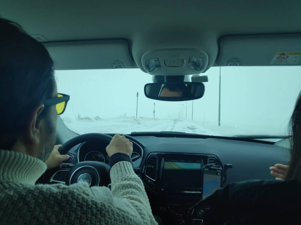 Nos atendió una simpática noruega que nos recordó lo de «similar», nos dio a elegir entre un Jeep Compass o el Hyundai Tudson. Como el Tudson era el coche que había tenido en Arabia Saudi para el Dakar, pues elegí el Jeep. Todo un acierto. El Compass era prácticamente nuevo, y 4×4. Es un poco mas pequeño que el Rav 4, pero tiene varias cosas que me encantaron: Navegador en español, volante y asientos calefactados que se agradecen, y un sistema 4×4 sin reductora, pero con 4 posiciones de gestión electrónica, auto, arena, barro y NIEVE. Muy recomendable, el coche no nos hizo ni un extraño, fiable y seguro.