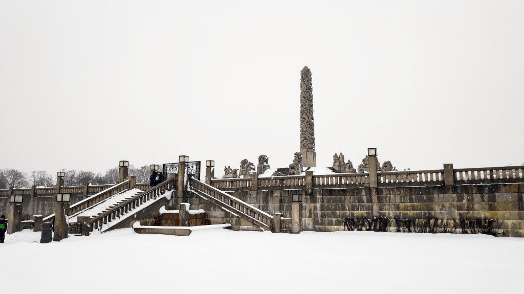 Primera parada en el Parque Vigeland, con cientos de estatuas que representan diferentes actitudes humanas y el famoso Monolito, que es un símbolo de la ciudad de Oslo. Verlo nevando, fue una delicia.