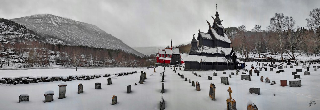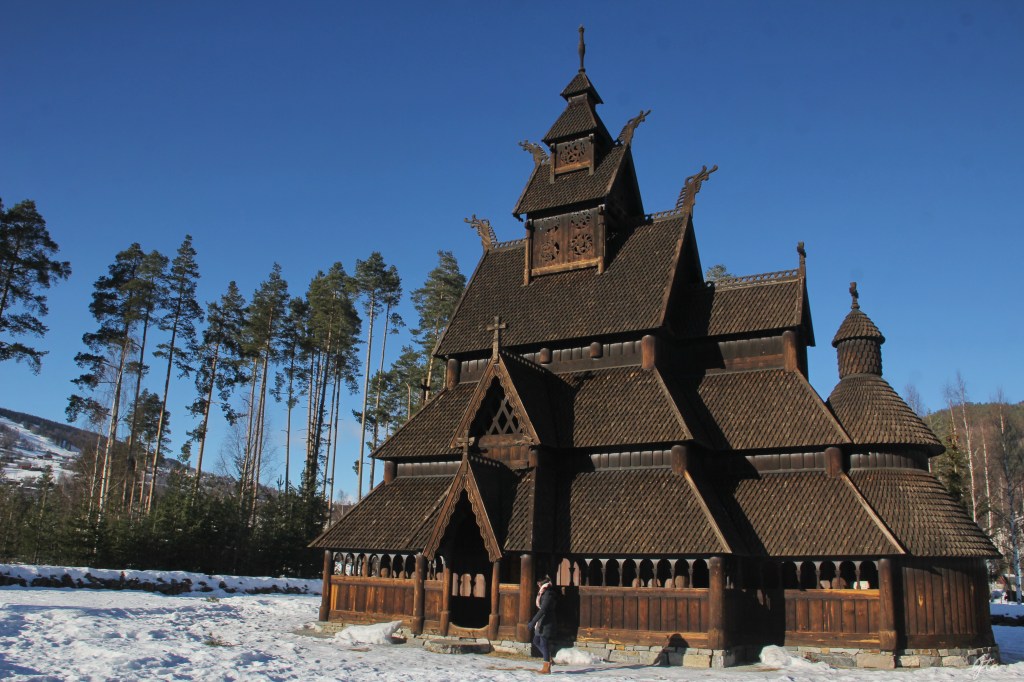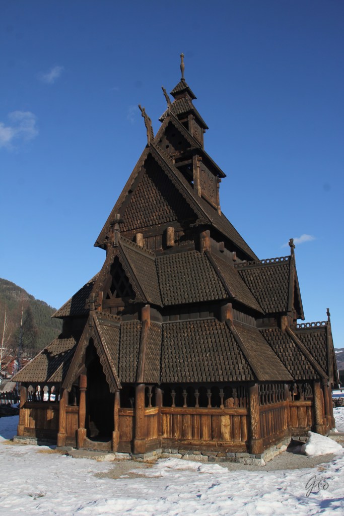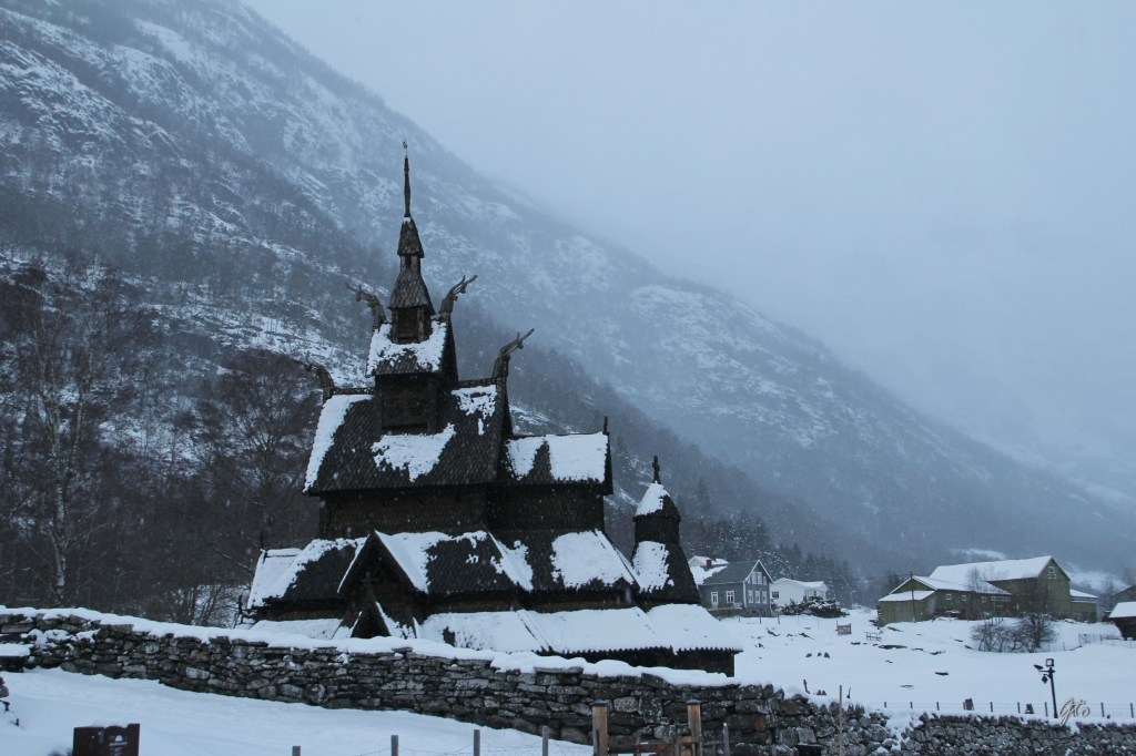 Despues de GOL, comenzó un puerto de montaña, y como en la escena de 8 apellidos vascos, cruzamos un túnel de unos 6 km, y pasamos de golpe de un tímido sol muy bajito, a una pequeña nevada. Pasamos una estación de Esquí llamada SkiStar Hemsedal. y poco después, visitamos otra bonita iglesia, esta vez hay que desviarse un par de km, pero merece la pena, Iglesia de Borgund, del siglo XII, estaba nevando y era preciosa.