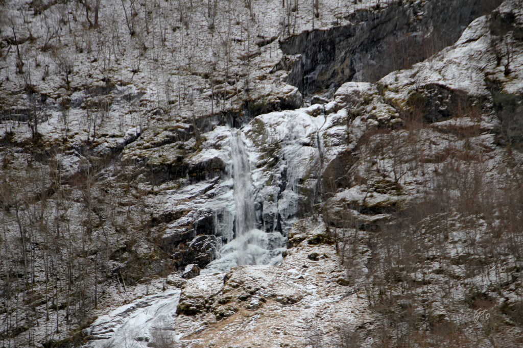 Pasado el puerto de montaña, dejo de nevar e incluso vimos de nuevo el sol, lo que nos animo a intentar ir a una de las carreteras míticas de Noruega, la conocida como carretera de las nieves, que era la antigua carretera de montaña que conectaba Lærdalsøyri con Flam, pero nos la encontramos cerrada. En Lærdalsøyri vimos como la superficie del puerto del pueblo, estaba congelado, es tan baja la salinidad del fiordo que puede congelarse entero.