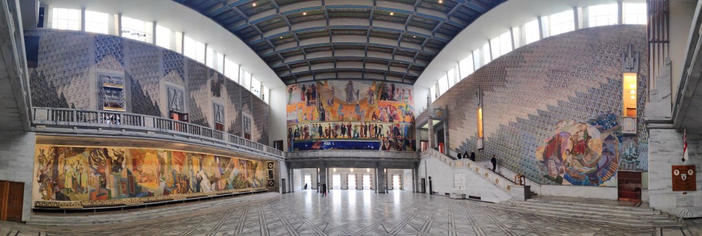 Despues al puerto, paseito por el puerto hasta la fortaleza de Akershus, que vimos por fuera, luego nos fuimos a conocer por dentro, los salones del Ayuntamiento de Oslo, famosos por ser la sede de la entrega de los premios Nobel de la Paz, que son los únicos que se entregan fuera de Suecia.